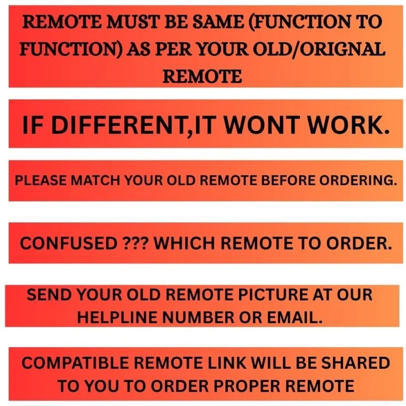 - Kind Disclaimer: Remote must be Exactly Same (Function to Function) as per your Old/Original Remote (PLEASE MATCH PROPERLY BEFORE ORDERING) – If Different, it won’t Work